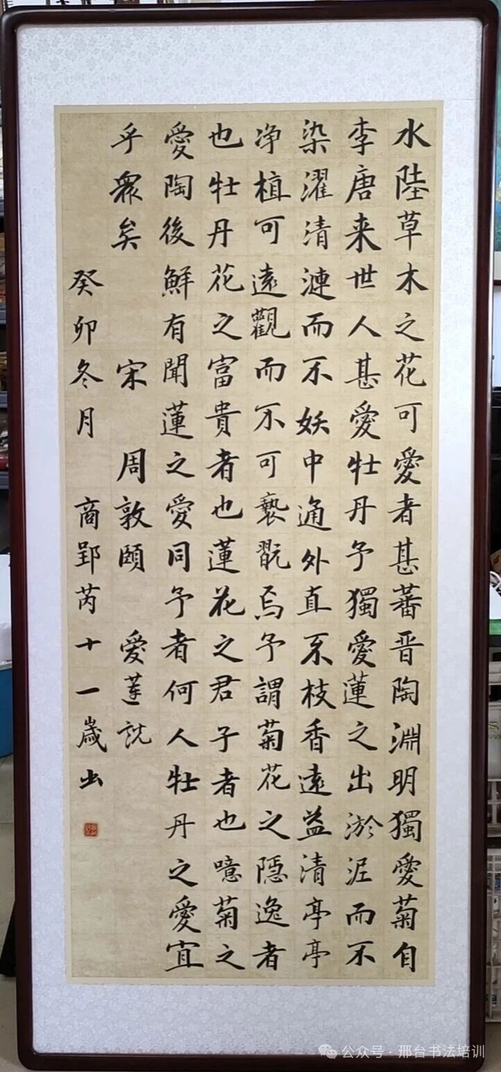 2018年6月11日,刚满6周岁的老大(商郢芮)开启了第一堂书法课,我与笔墨纸砚也迎来了真正的相知。此后三年,我每周两次陪她上课,风雨无阻。2021年9月,孩子校内课业渐重,练字频率骤减。为了让她坚持下去,我决定重拾笔墨:一张15格的米字格纸,我写10格,留5格给她,以陪伴延续这份热爱。楷书、隶书、行书轮番修习,《爱莲说》《百家姓》《兰亭序》的完整作品逐一完成并装裱珍藏;2018年5月,孩子顺利通过书法十级考试,而我也在2019年3月凭借《卧云听泉》入展邢台市女书法家协会展览,成功加入市、区两级女书协,与笔墨的联结愈发深厚